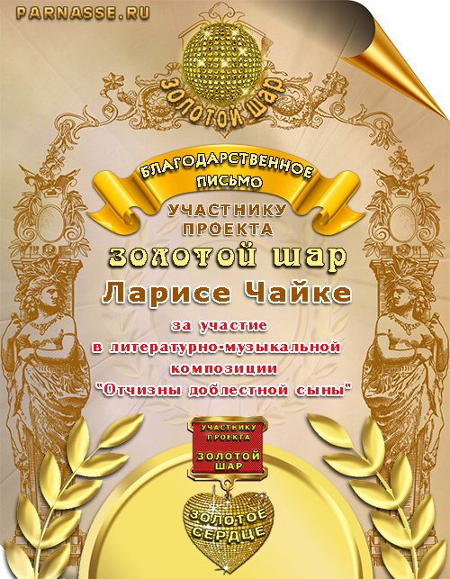 Медаль "ЗОЛОТОЕ СЕРДЦЕ" за участие в литературно-музыкальной композиции "ОТЧИЗНЫ ДОБЛЕСТНОЙ СЫНЫ"