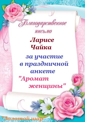Спасибо, Лариса, за яркость, оригинальность, неординарность! За доброту! За душевность! За отзывчивость!Желаем Вам здоровья, счастья, тепла и любви близких, больших творческих успехов и побед!