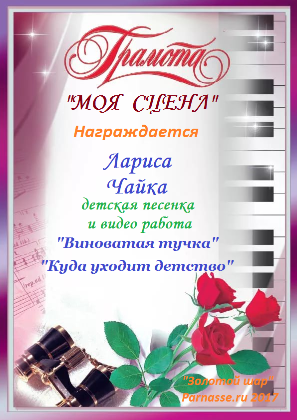 Первое место в конкурсе "Уж слышен Осени мотив" в песенной номинации "Лейся, песнь любви моей!", народное голосование. Поздравляем с красивой победой. Благодарим Вас, Лариса, за великолепные стихи к песне "С осенью- подружкой".
