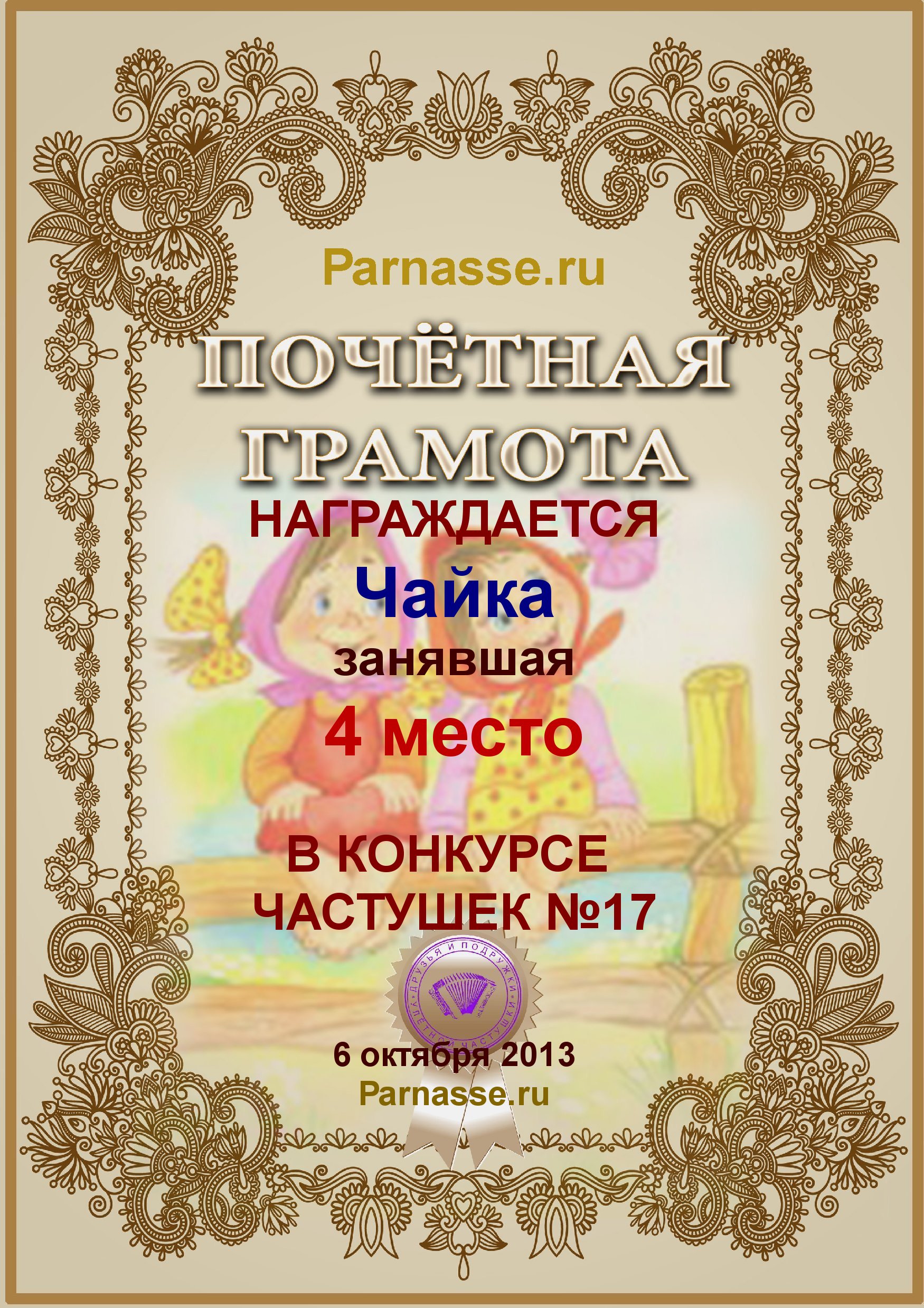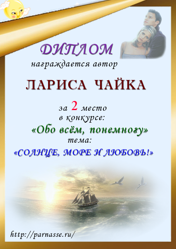 Первое место в праздничном конкурсе "Поздравим Парнас вместе!", в номинации "Лучшая поздравительная песнь Парнасу". Трёхлетний юбилей Парнаса - наш общий Праздник. Примите и Вы наши поздравления и пожелания крепкого Здоровья, Счастья, Вдохновения и творческих Открытий! Спасибо Вам огромное за великолепное музыкальное поздравление, пусть Ваша Муза всегда остается рядом, а Вы – с "Парнасом" на долгие и долгие годы! Произведение "Парнас, с Днем Рождения!!! (Совместная работа с Мартой Шаула)."