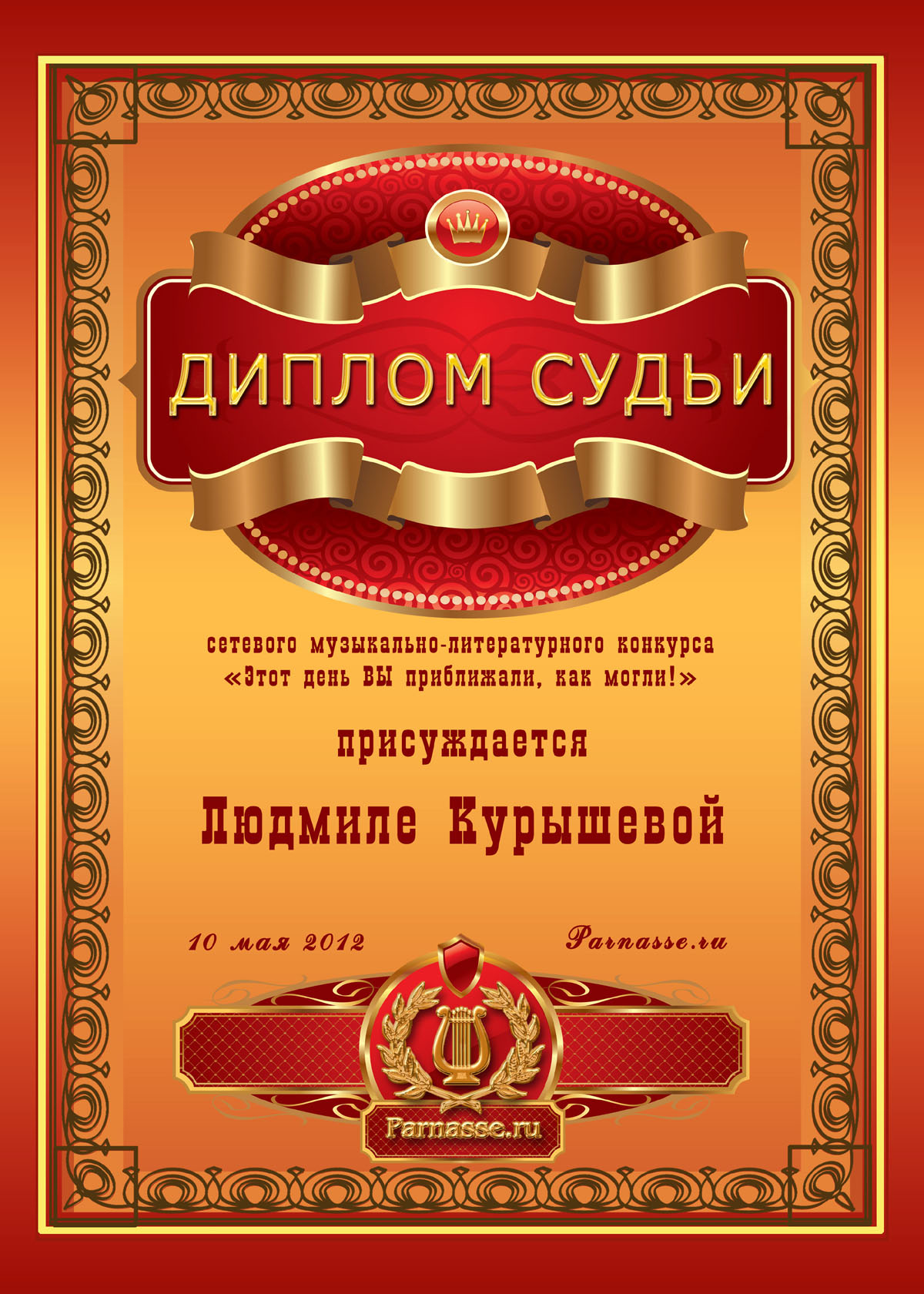 Диплом судьи конкурса «Этот день ВЫ приближали, как могли!»