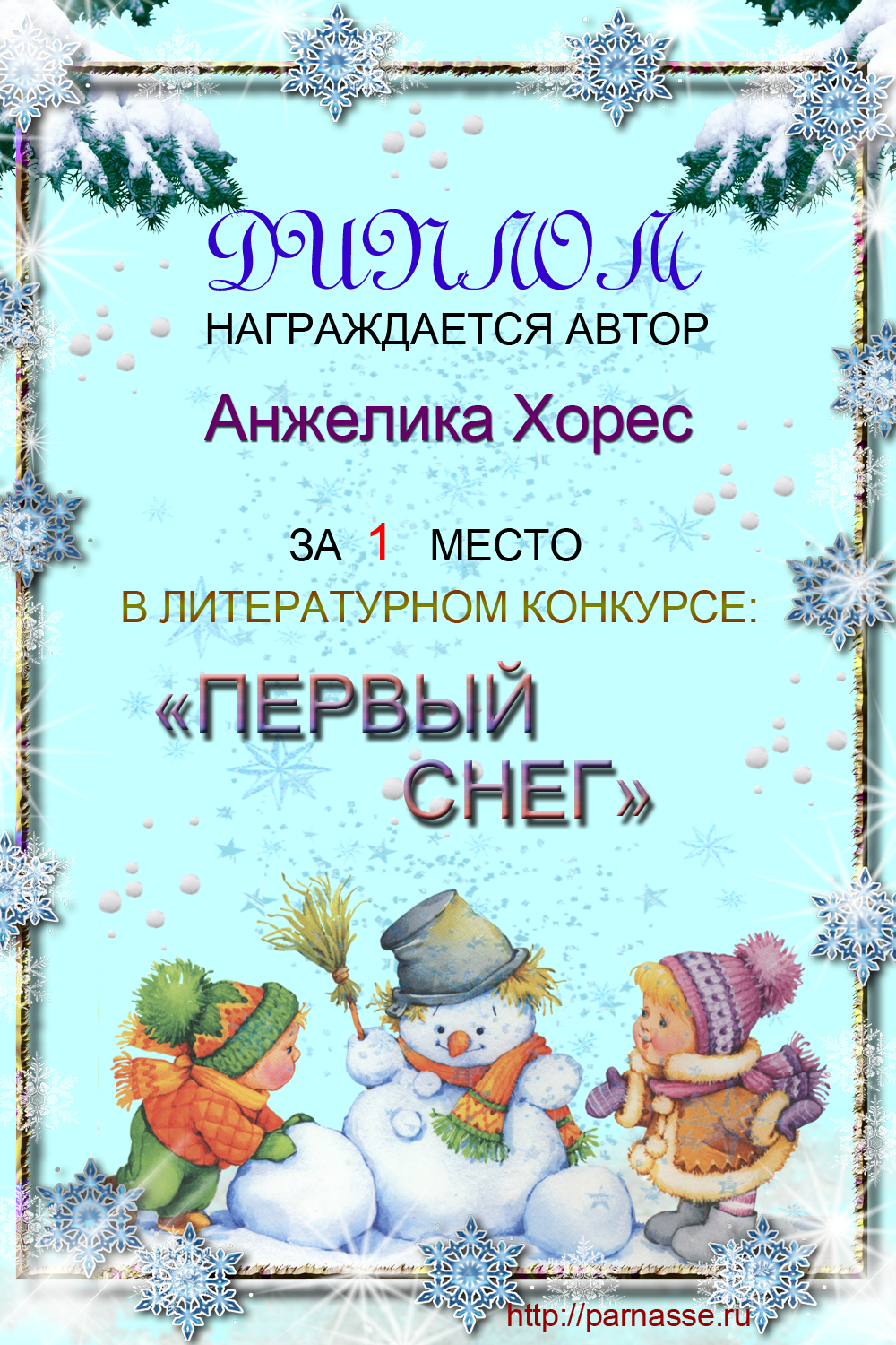 Диплом за 1 место в конкурсе "Первый снег"