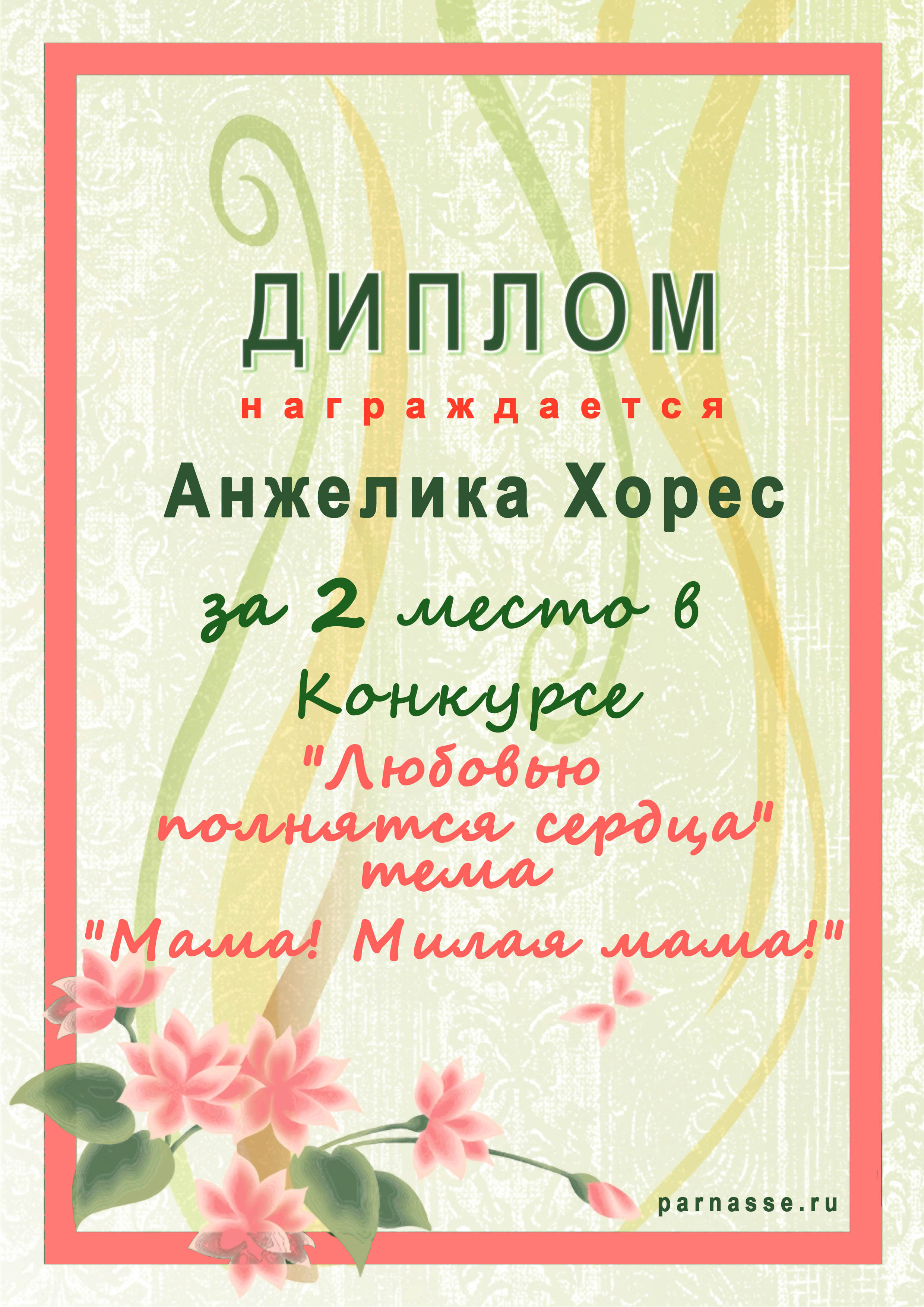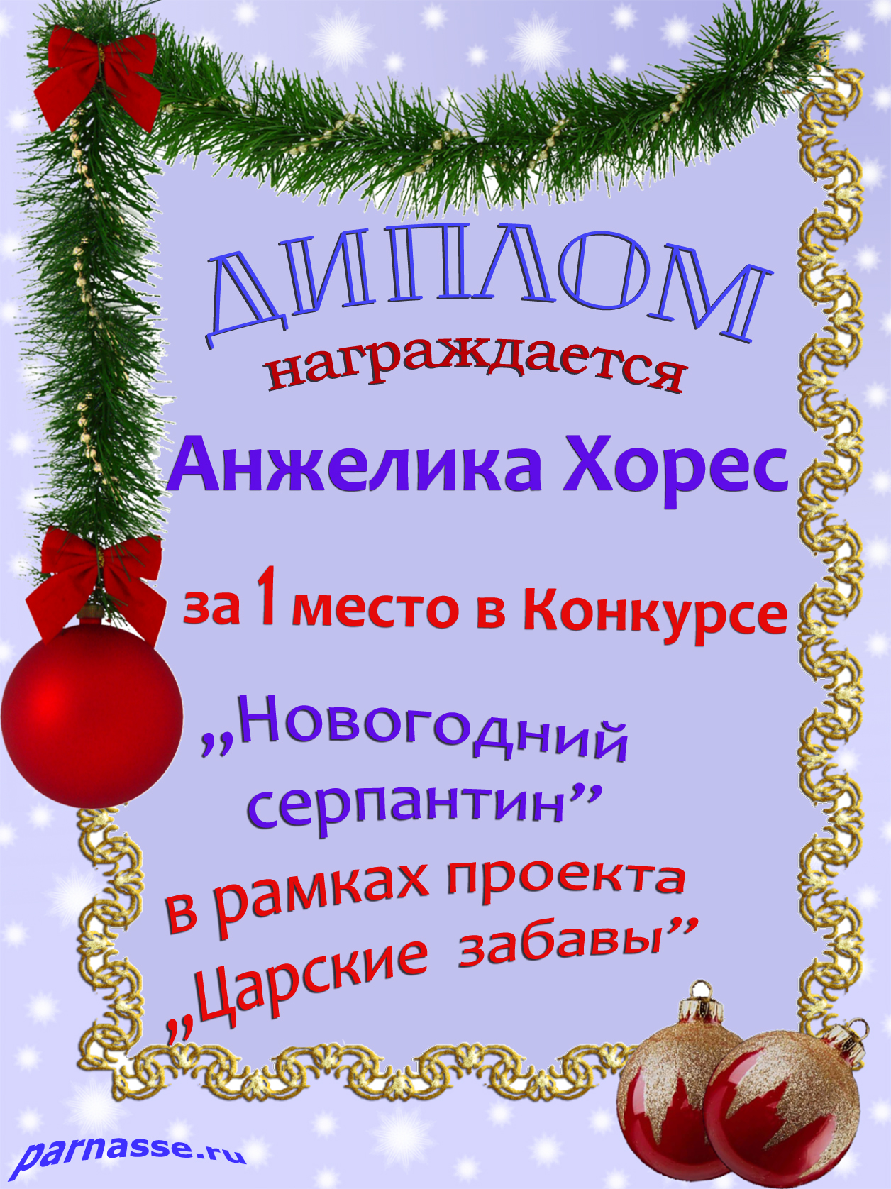 Диплом Победителя за 1 место в праздничном конкурсе "Поздравим Парнас с трёхлетием вместе!"