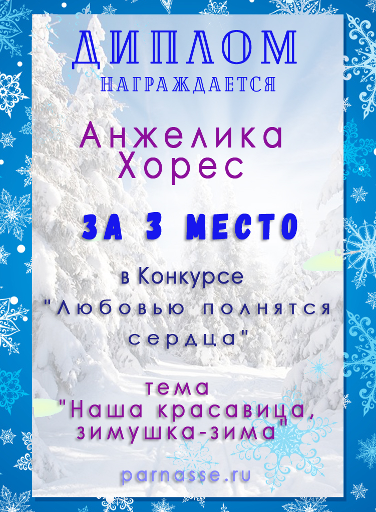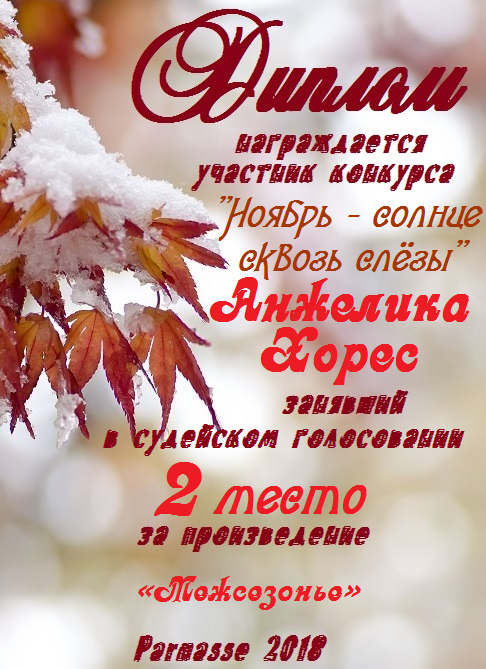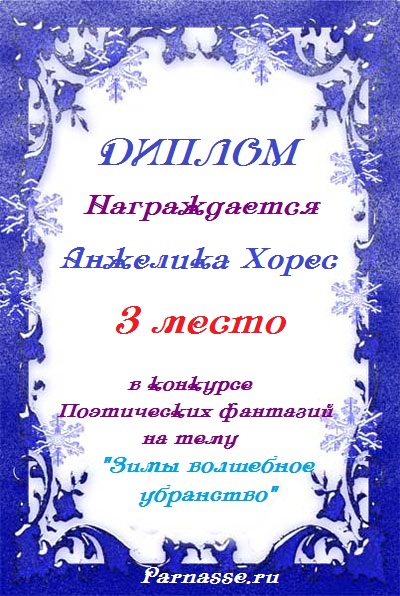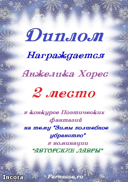 Диплом за 2 место в конкурсе "Литературный снегопад", поэзия, судейское голосование, произведение "Зимняя октава".