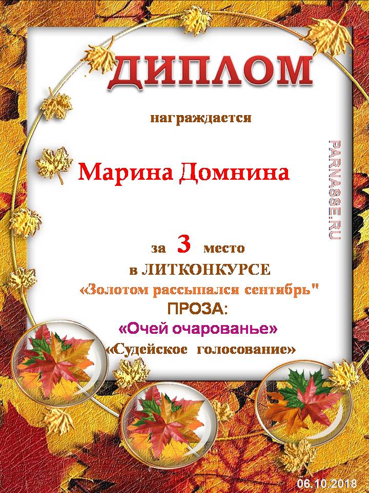 Поздравляем с занятым 3 местом в ЛИТКОНКУРСе «Золотом рассыпался сентябрь.,,», номинация – Проза (судейское голосование)!