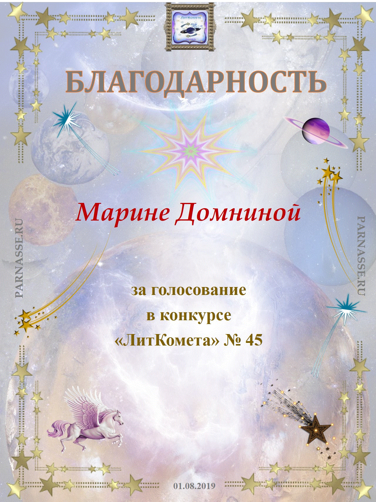 Поздравляю с занятым 1 местом в конкурсе «Литературная Комета – Полёт № 35» - номинация проза!