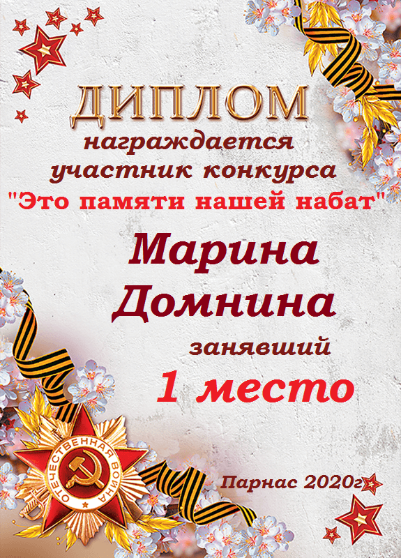 Первое место по решению Администрации и Главного судьи конкурса "Навечно в памяти"