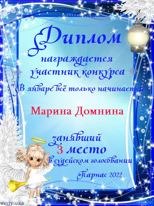Подарок/пожелание от: Лора Дан Время: 20 января 2021 в 13:41 Пожелание: Время проходит, и конкурса дни Мы завершаем. Пусть будут они В памяти Вашей как символ тепла, Радости, дружбы, пусть будет светла Ваша дорога - идите смелей! Будет прекрасным течение дней!.. |