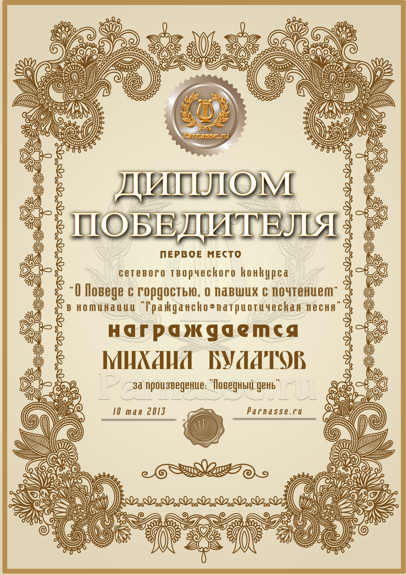Первое место в музыкально-литературном конкурсе «О Победе с гордостью, о павших – с почтением!» Общее голосование. Номинация «Песня гражданско-патриотической тематики»! Исполнителю песни «ПОБЕДНЫЙ ДЕНЬ»! Поздравляем с красивой, достойной Победой в конкурсе!