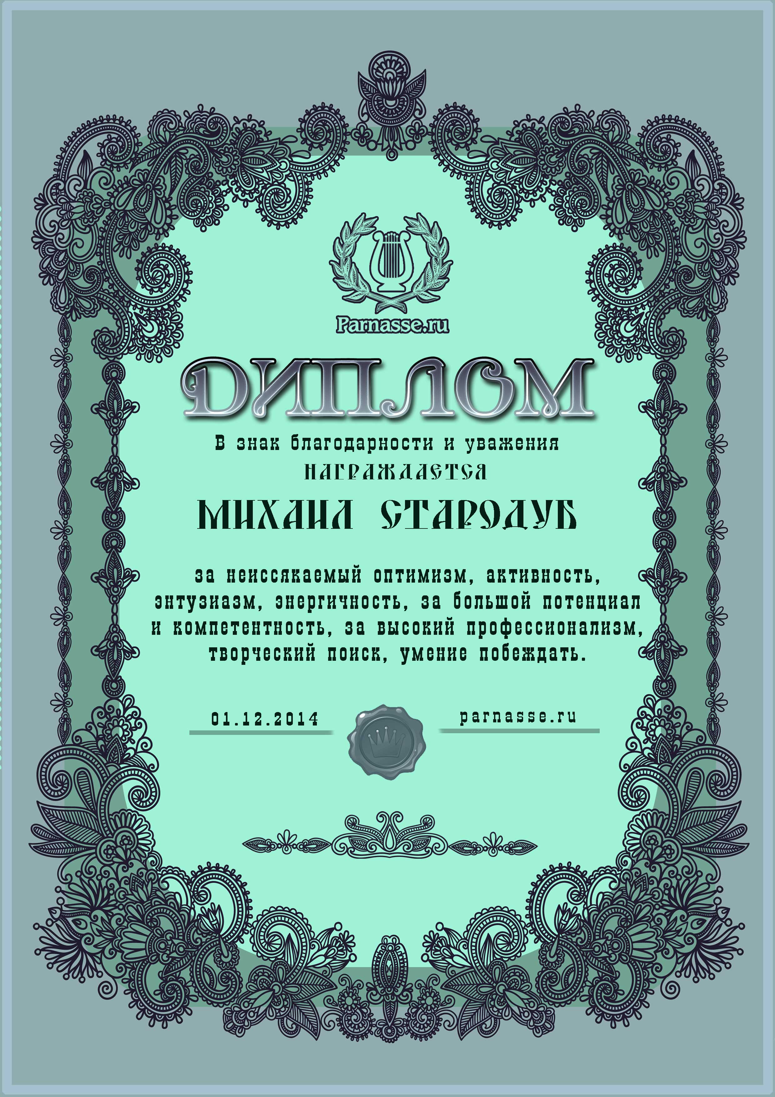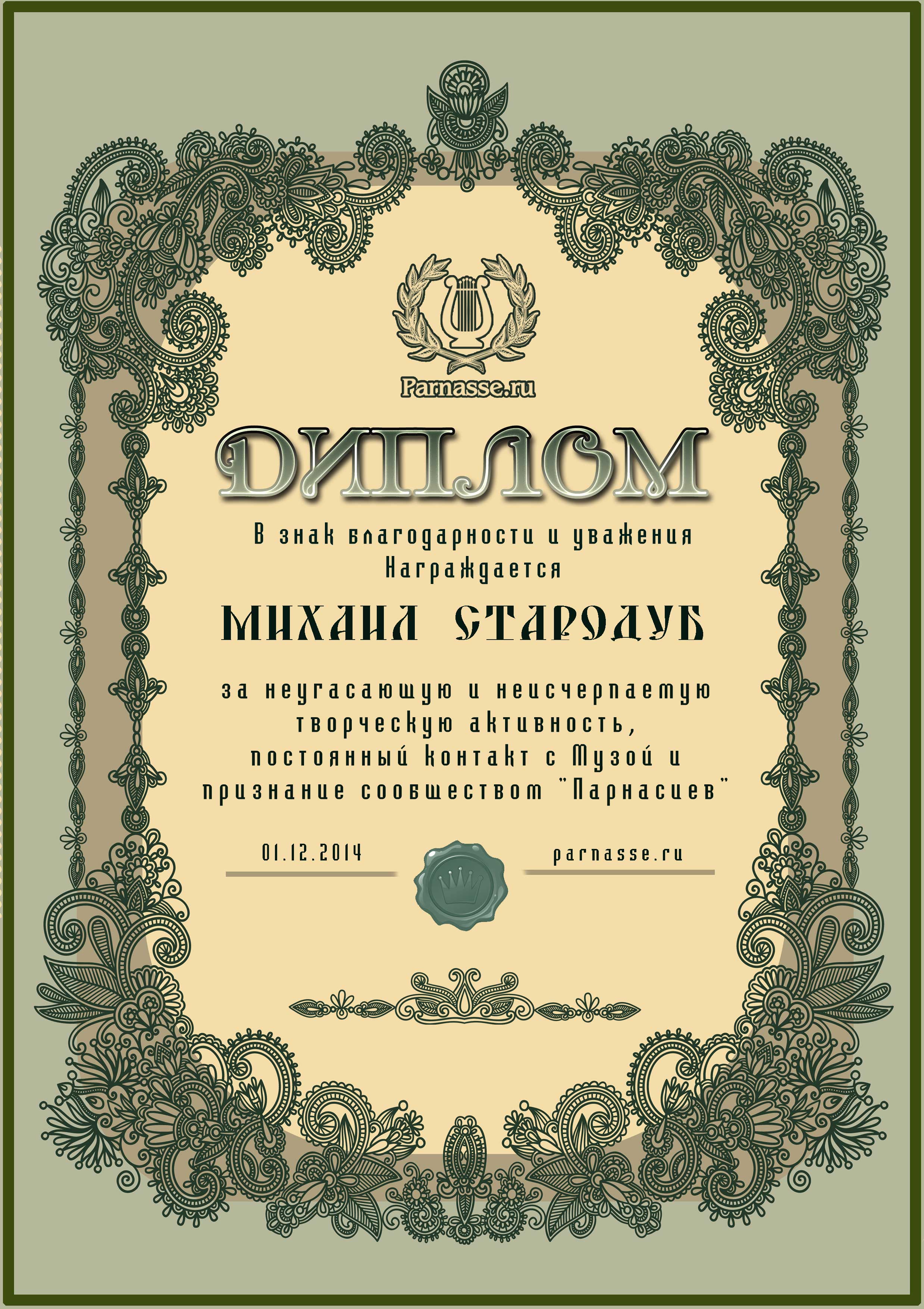 За неугасающую и неисчерпаемую творческую активность, постоянный контакт с Музой и признание сообществом "Парнасцев".От всей души желаем Вам, Михаил, здоровья, любви, успехов, благополучия, удачи и творческого вдохновения!