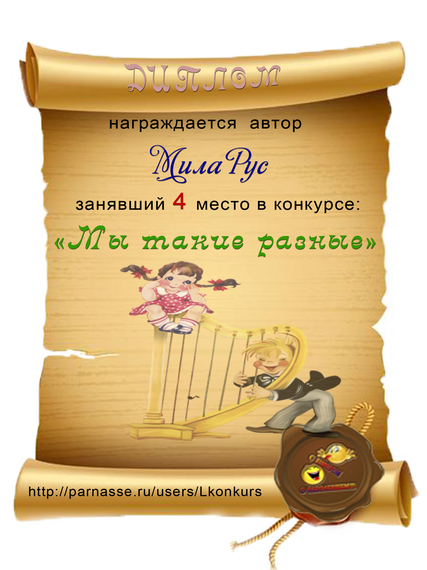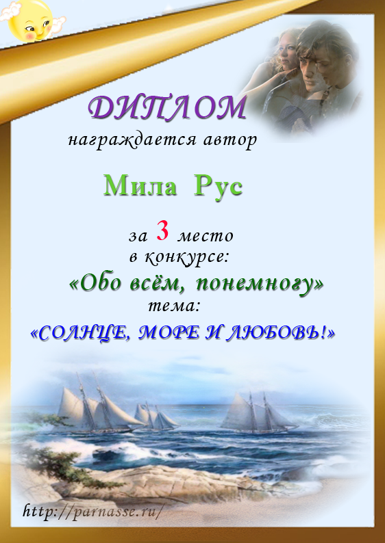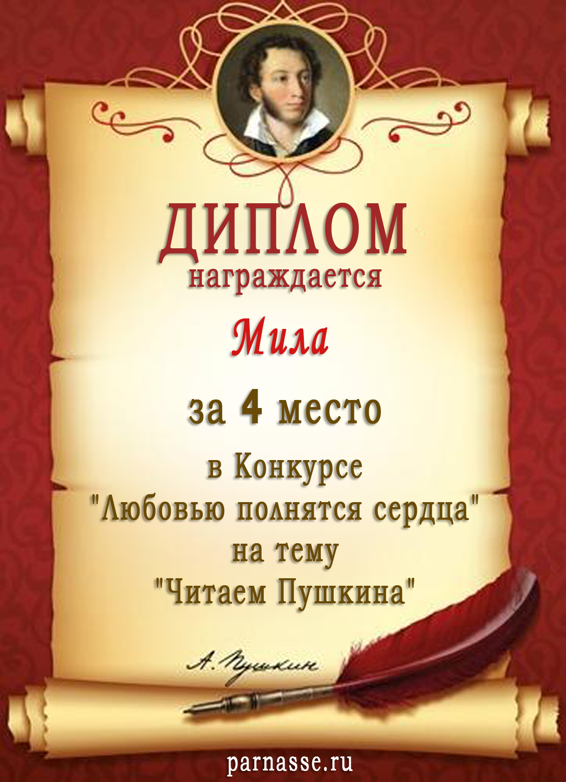 За 4 место в Конкурсе "Любовью полнятся сердца" на тему "Читаем Пушкина"