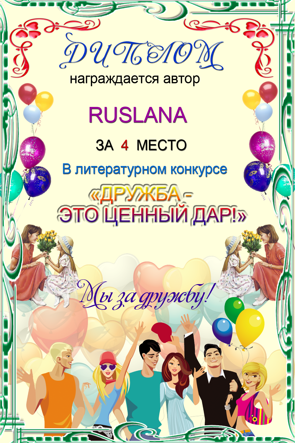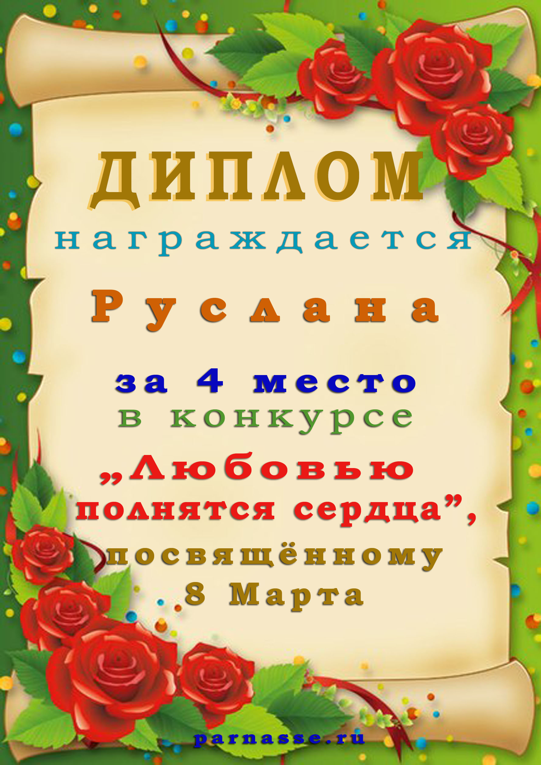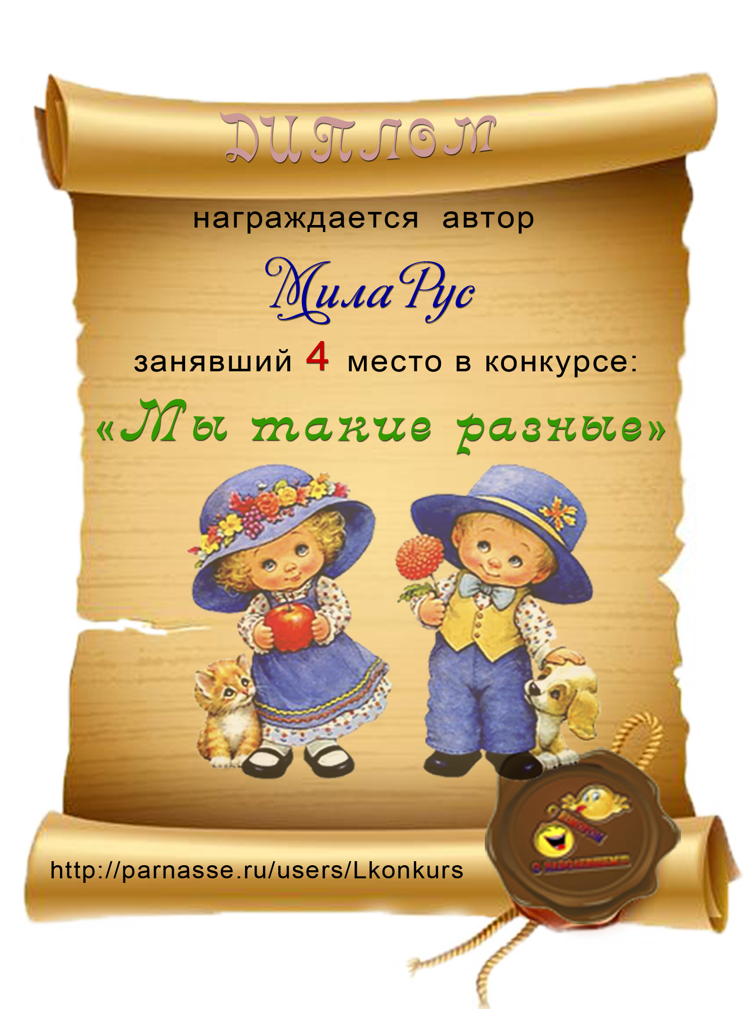 За 4 место в Конкурсе "Любовью полнятся сердца" на тему "Читаем Пушкина"
