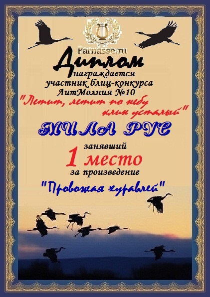 Первое место в Блиц-конкурсе №10 "Летит, летит по небу клин усталый" за произведение «ПРОВОЖАЯ ЖУРАВЛЕЙ». Поздравляем!