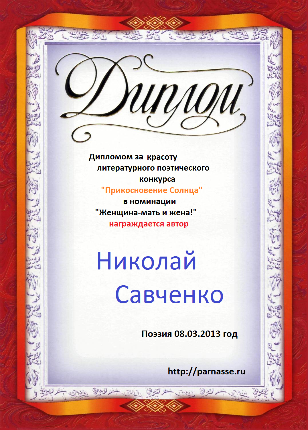 Диплом в конкурсе поэзии "Прикосновение Солнца"