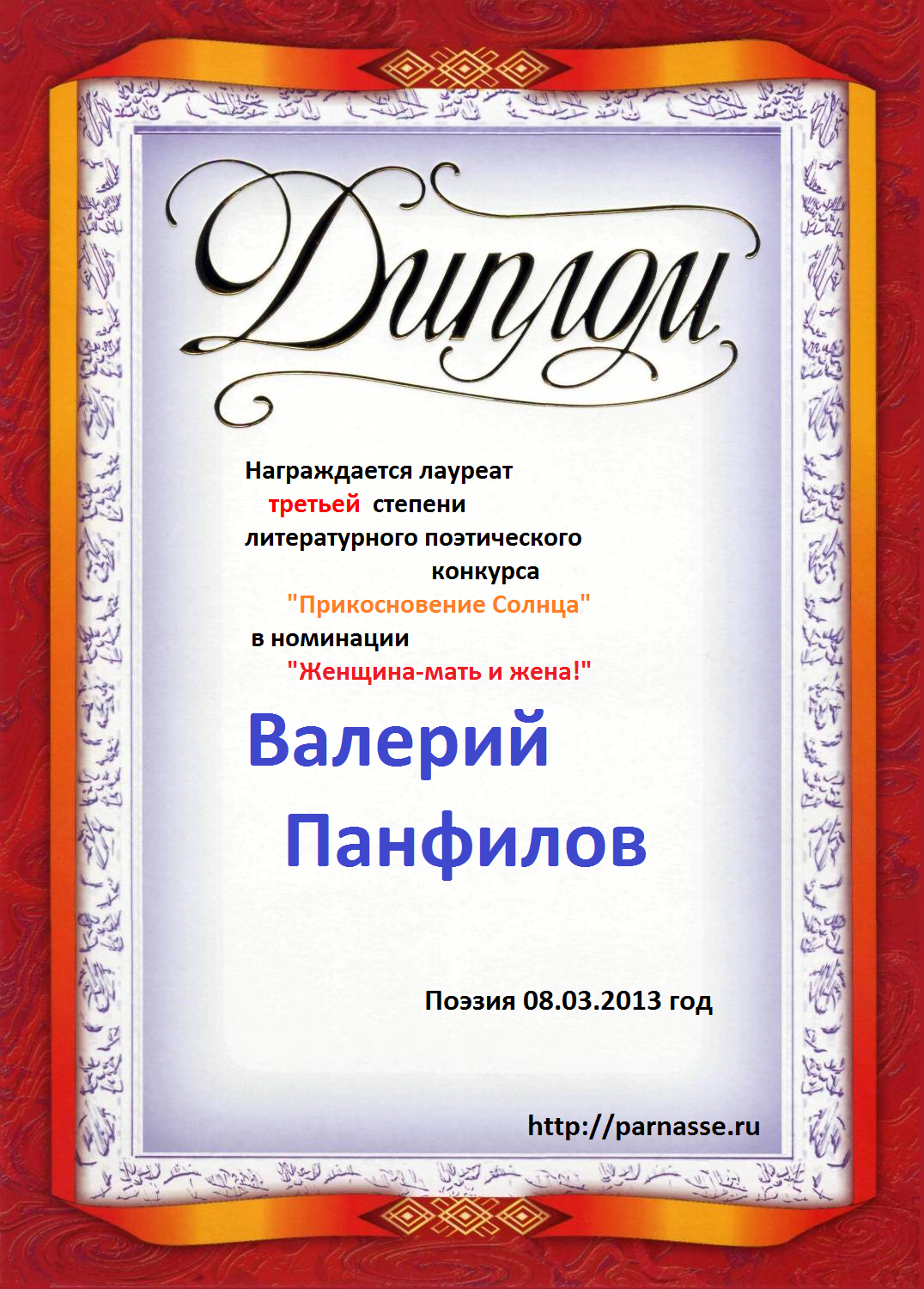 В анонимном конкурсе "Прикосновение Солнца" - ПОЭЗИЯ 2013 - номинация «Женщина-мать и жена»
