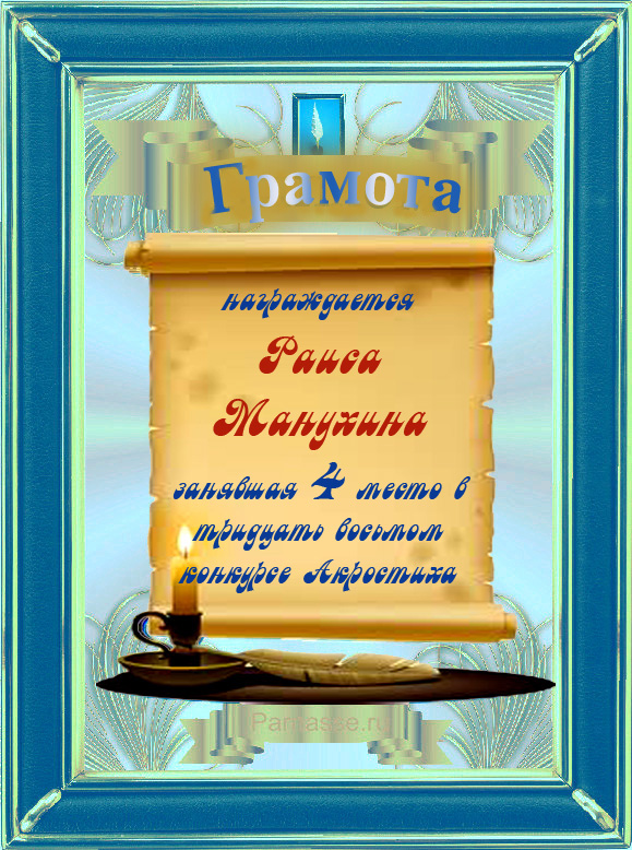 Первое место в праздничном конкурсе "Поздравим Парнас вместе!", в номинации "Самое необычное поздравление Парнаса с Днём Рождения". Сердечно благодарим Вас за великолепные оригинальные поздравления и прекрасные пожелания нашему Парнасу! Мы рады, что Вы с нами, и желаем, чтобы Ваше творчество и впредь радовало нас своей красотой, легкостью, образностью и глубочайшим эмоциональным смыслом! Пусть удача всегда сопутствует Вам во всех начинаниях, а здоровье никогда не подводит, будьте всегда на пике творческой активности и мы с Вами встретим еще не одну годовщину сайта! Будьте счастливы и всегда готовы к новым свершениям на благо искусства! Произведение "Друзьям сайта"