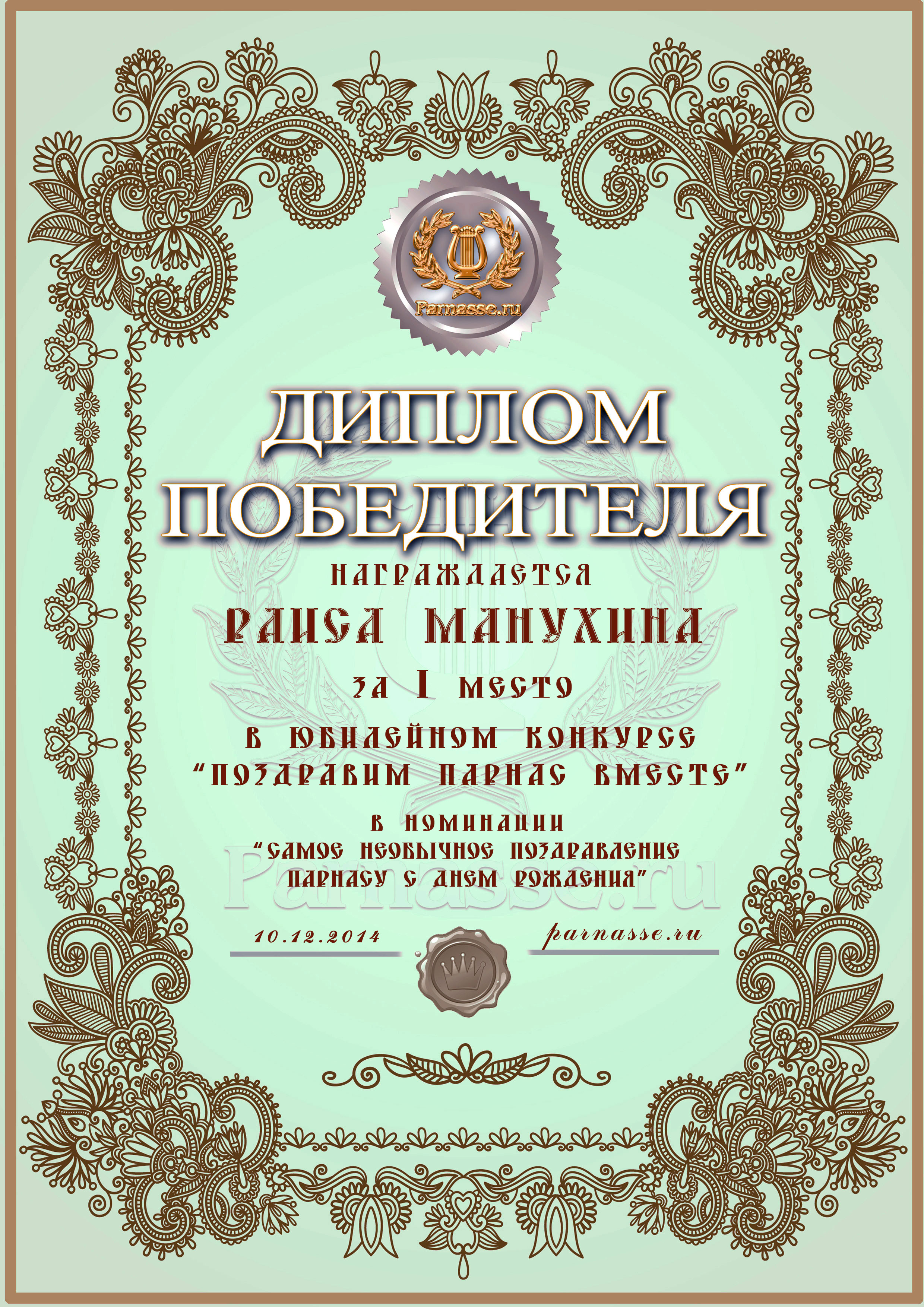 Первое место в праздничном конкурсе "Поздравим Парнас вместе!", в номинации "Самое необычное поздравление Парнаса с Днём Рождения". Сердечно благодарим Вас за великолепные оригинальные поздравления и прекрасные пожелания нашему Парнасу! Мы рады, что Вы с нами, и желаем, чтобы Ваше творчество и впредь радовало нас своей красотой, легкостью, образностью и глубочайшим эмоциональным смыслом! Пусть удача всегда сопутствует Вам во всех начинаниях, а здоровье никогда не подводит, будьте всегда на пике творческой активности и мы с Вами встретим еще не одну годовщину сайта! Будьте счастливы и всегда готовы к новым свершениям на благо искусства! Произведение "Поздравляю Парнас"