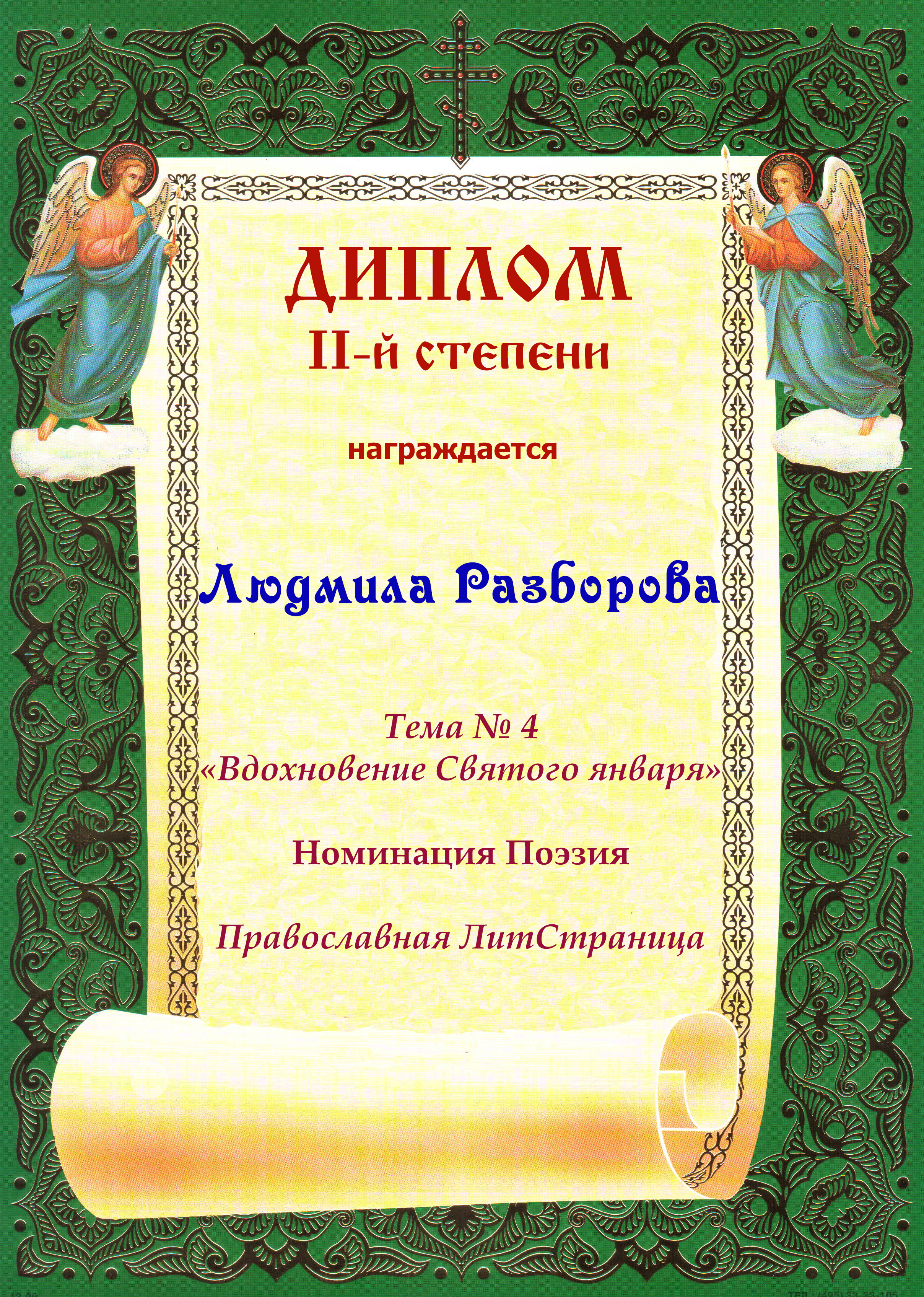 Лауреат II-й степени на Православной ЛитСтранице. Номинация ПОЭЗИЯ. Стихотворение "Старый Новый год".