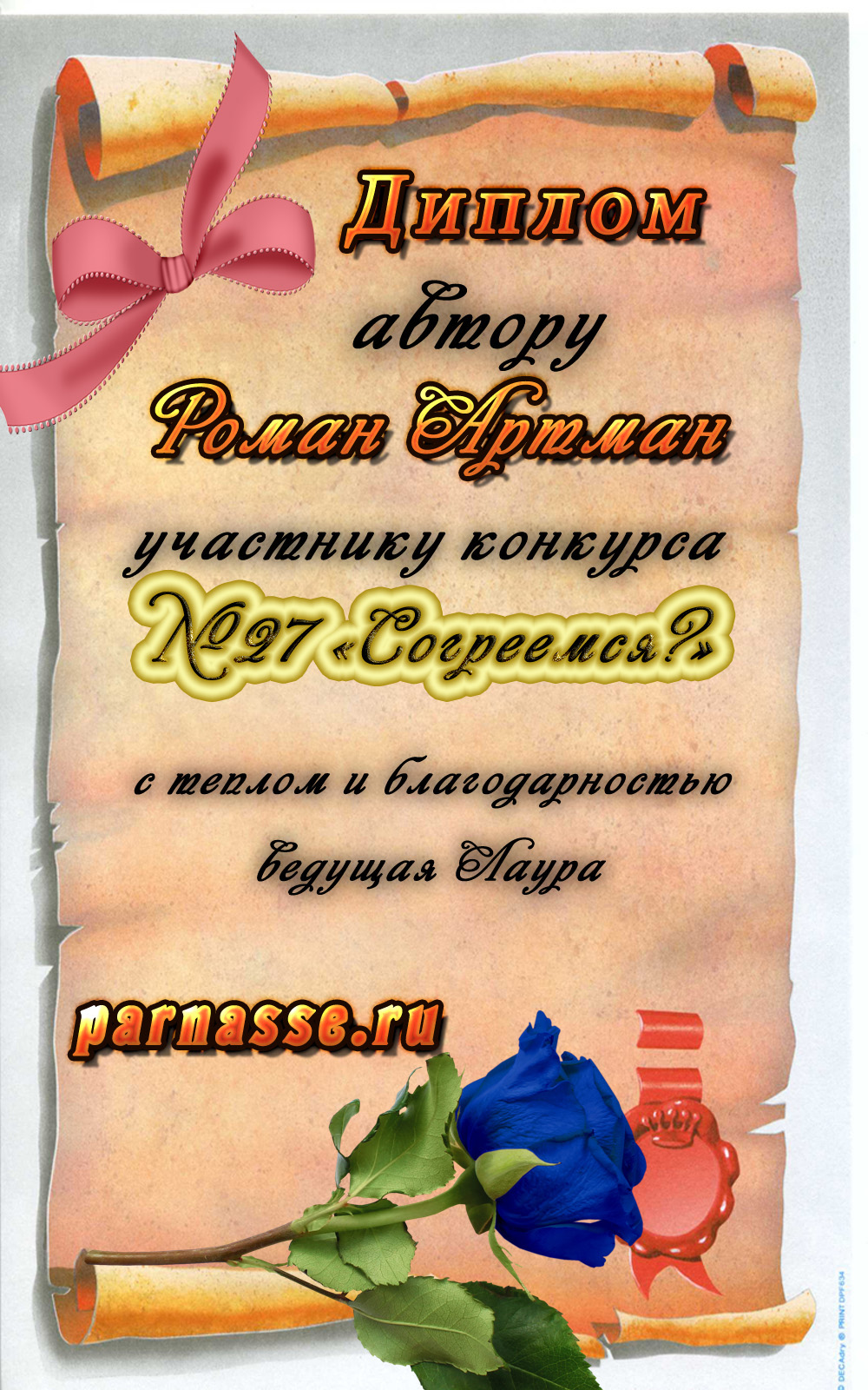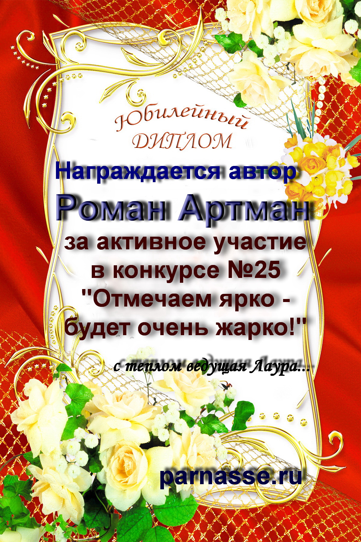 Уважаемый Роман!От всего сердца поздравляем Вас с блестящей ПОБЕДОЙ в номинации «Вкусная ПОЭЗИЯ», во "Вкусном конкурсе"