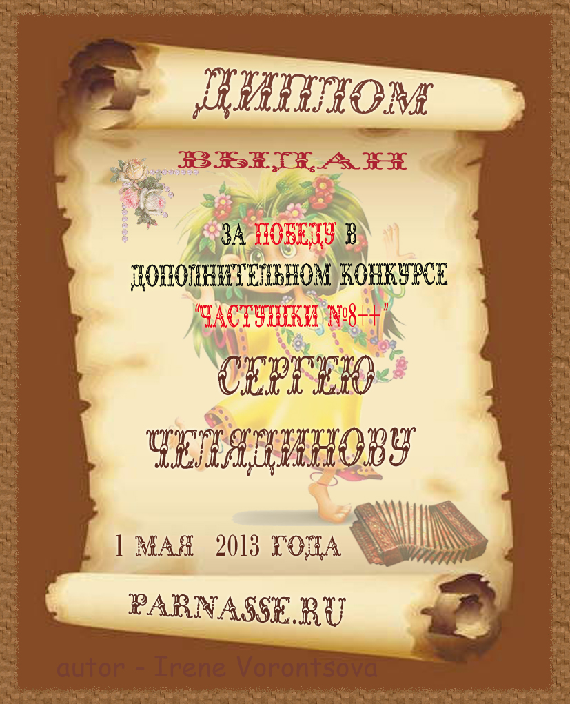 Диплом победителя в дополнительной номинации конкурса частушек № 8++. Мои поздравления, Сергей!