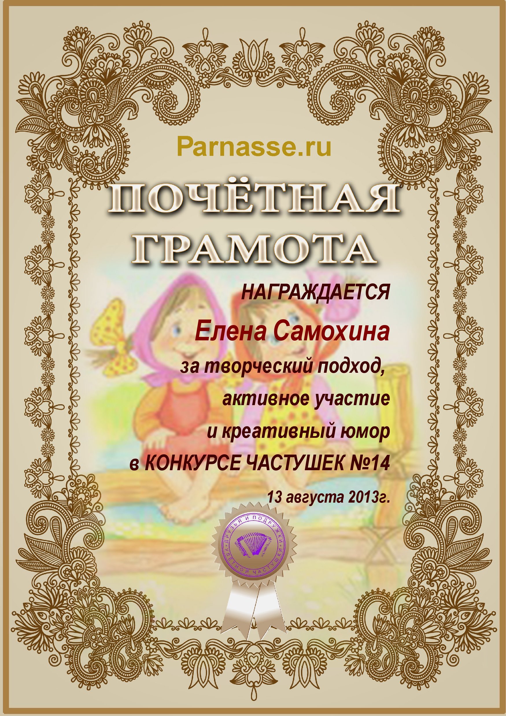 Похвальная грамота за активное участие в конкурсе лимериков № 53+ (4.05.2014 г.)