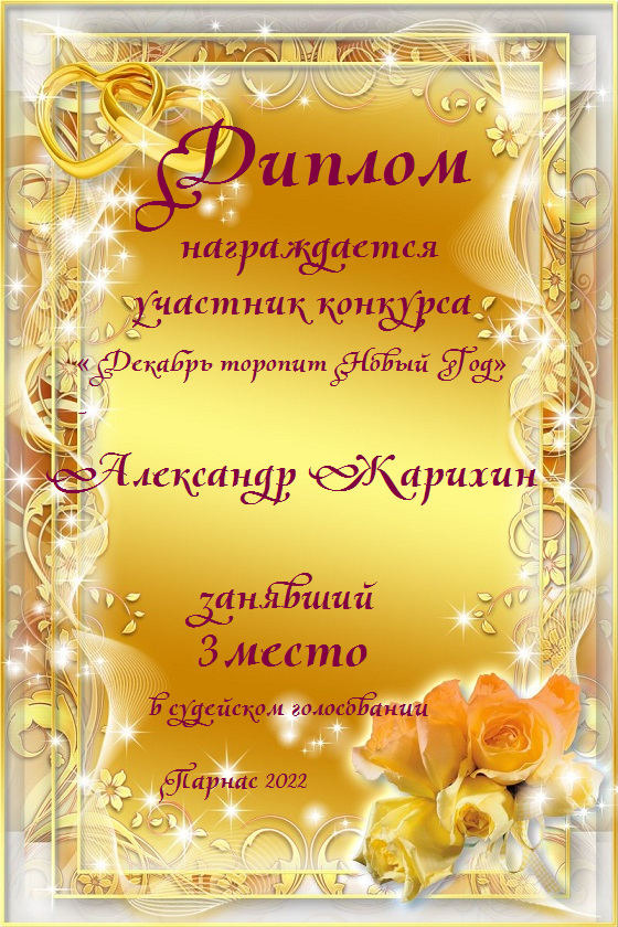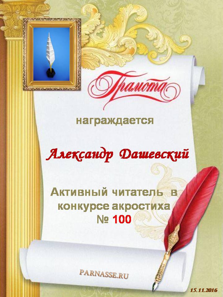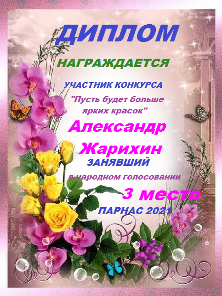 За неугасающую и неисчерпаемую творческую активность, постоянный контакт с Музой и признание сообществом "Парнасцев".От всей души желаем Вам, Александр, здоровья, любви, успехов, благополучия, удачи и творческого вдохновения!