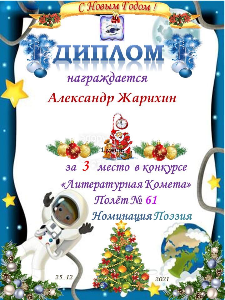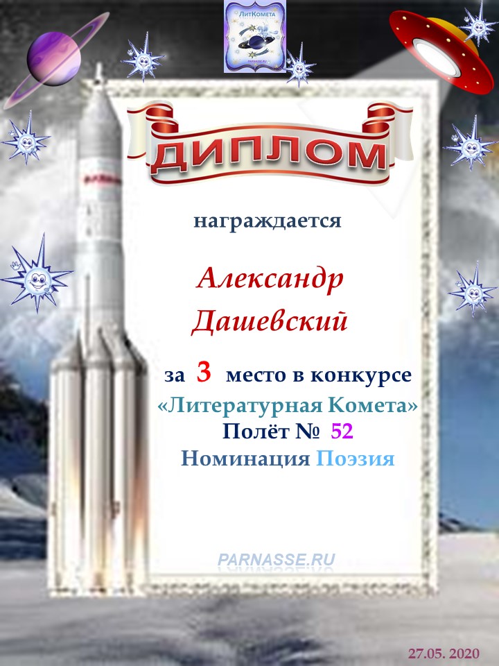Поздравляю с занятым 3 местом в конкурсе "Литературная Комета - Полёт № 52" - Номинация Поэзия!