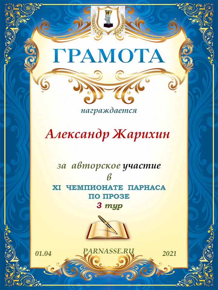 ![]() Медаль автора - участника 3 тура XI Чемпионата Парнаса по Прозе