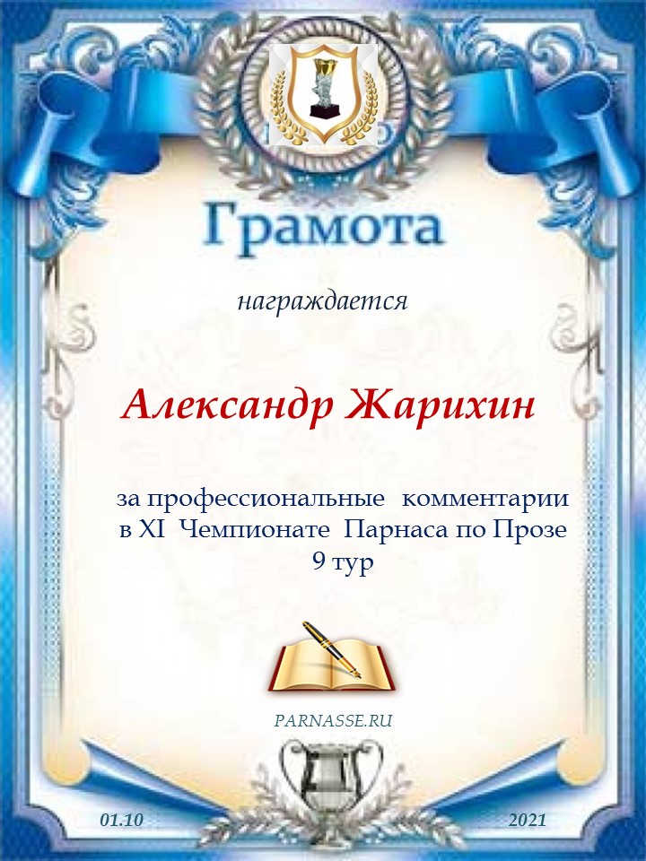 Благодарю за профессиональные комментарии в 9 туре XI Чемпионата Парнаса по Прозе!