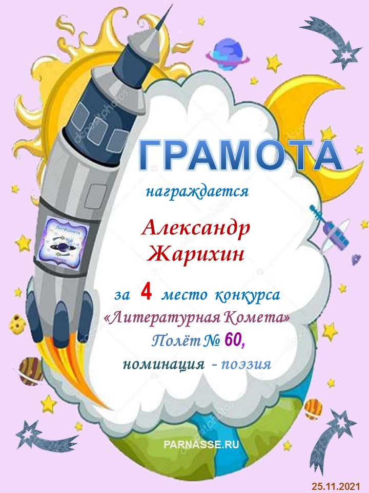 Поздравляю с занятым 4 местом в конкурсе "Литературная Комета - Полёт № 59" Номинации Поэзия!