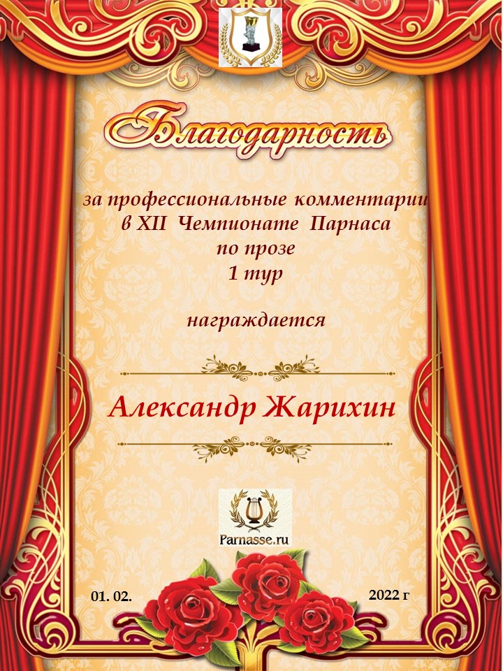 Большое спасибо за профессиональные и объективные комментарии в 1 туре XI Чемпионата Парнаса по Прозе!