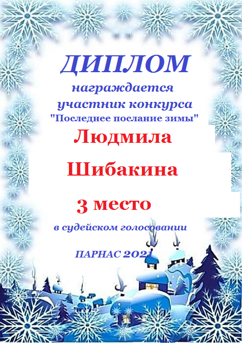 За яркое участие в конкурсе "Последнее послание зимы". Спасибо за прекрасный конкурсный стих. Желаем отличного настроения, вдохновения и ждём с нетерпением Ваши чудесные стихотворения в новых конкурсах!