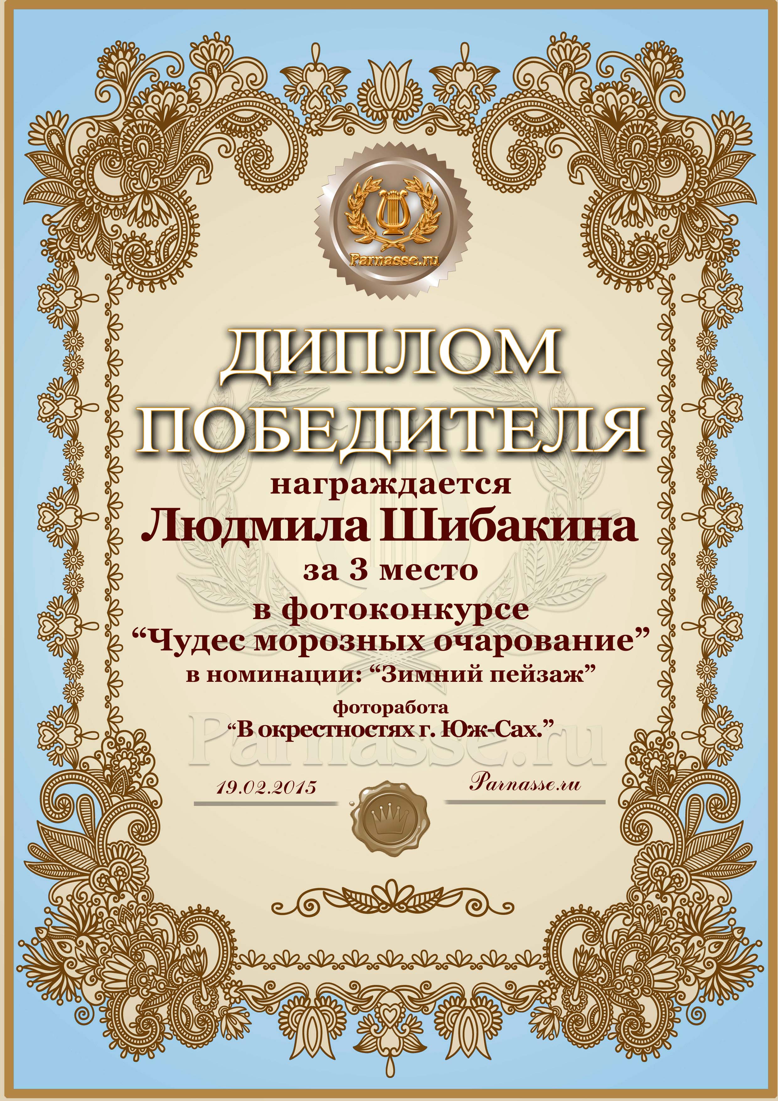 Диплом за 1 место в фотоконкурсе "Чудес морозных очарование"