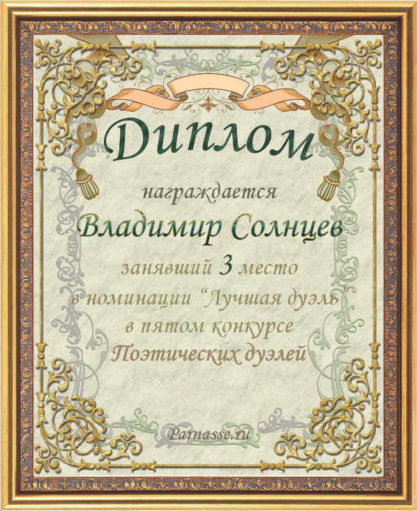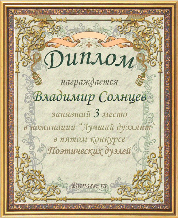 Диплом за третье место в номинации "Лучший дуэлянт" в пятом конкурсе Поэтических дуэлей