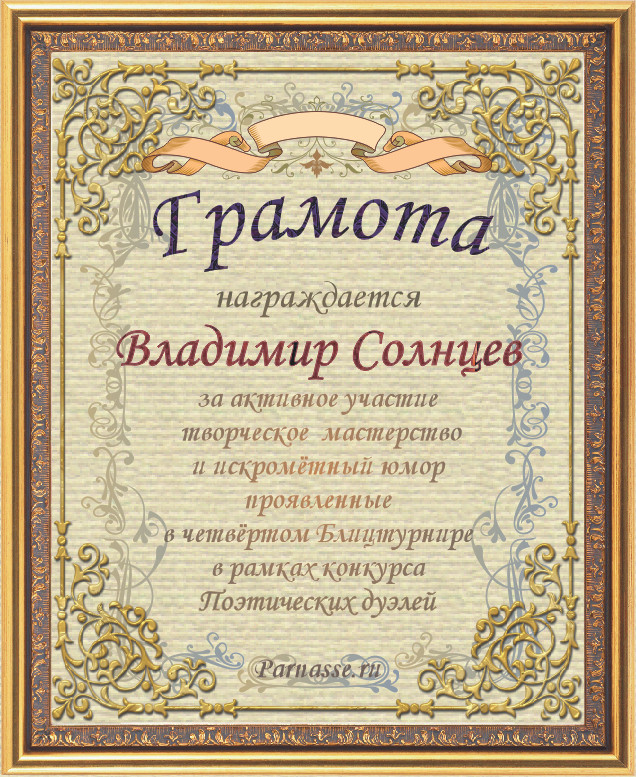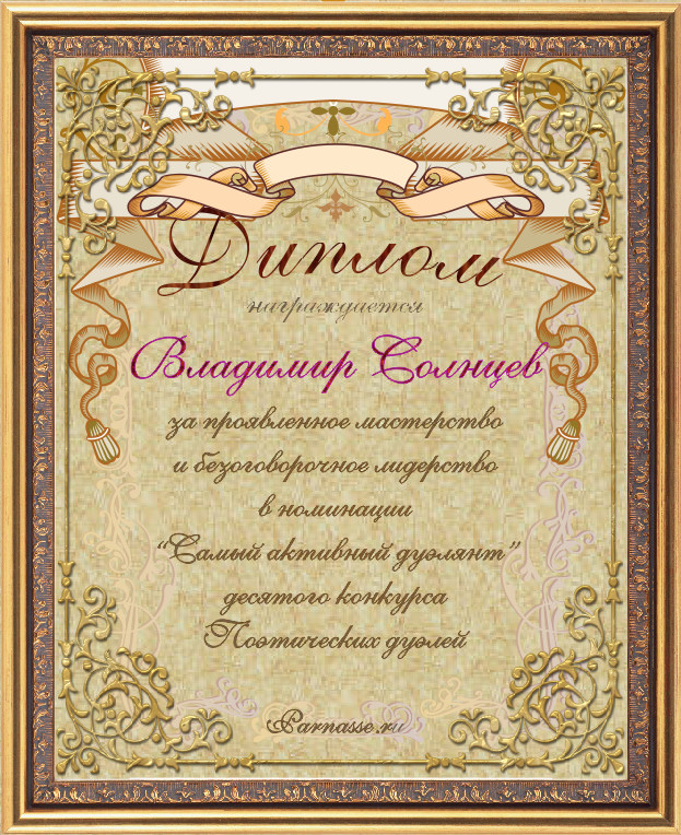Диплом присуждён в номинации "Самый активный дуэлянт" десятого конкурса поэтических дуэлей