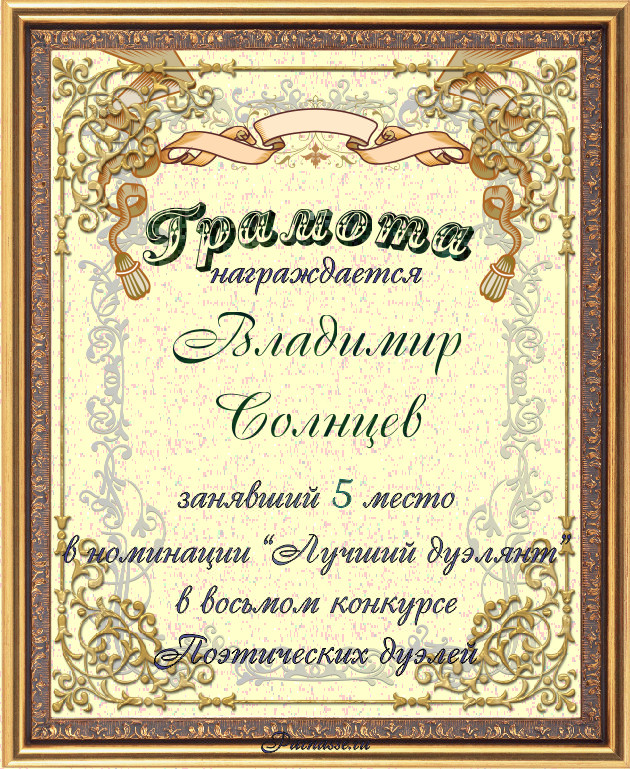 Грамота за 5-е место в номинации "Лучший дуэлянт" в восьмом конкурсе поэтических дуэлей