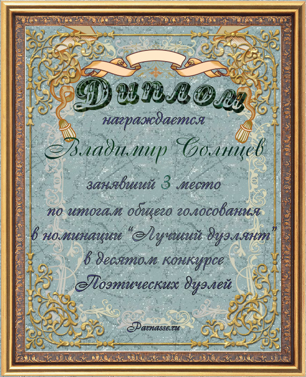 Диплом за 3-е место в номинации "Лучший дуэлянт" по итогам общего голосования в десятом конкурсе поэтических дуэлей