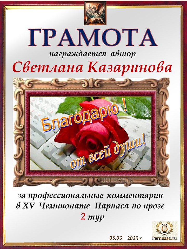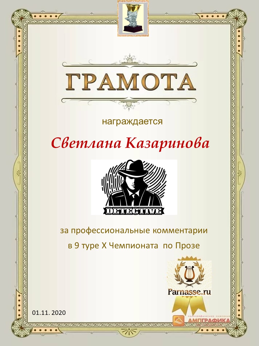 Благодарю за профессиональные комментарии в 9 туре XI Чемпионата Парнаса по Прозе!