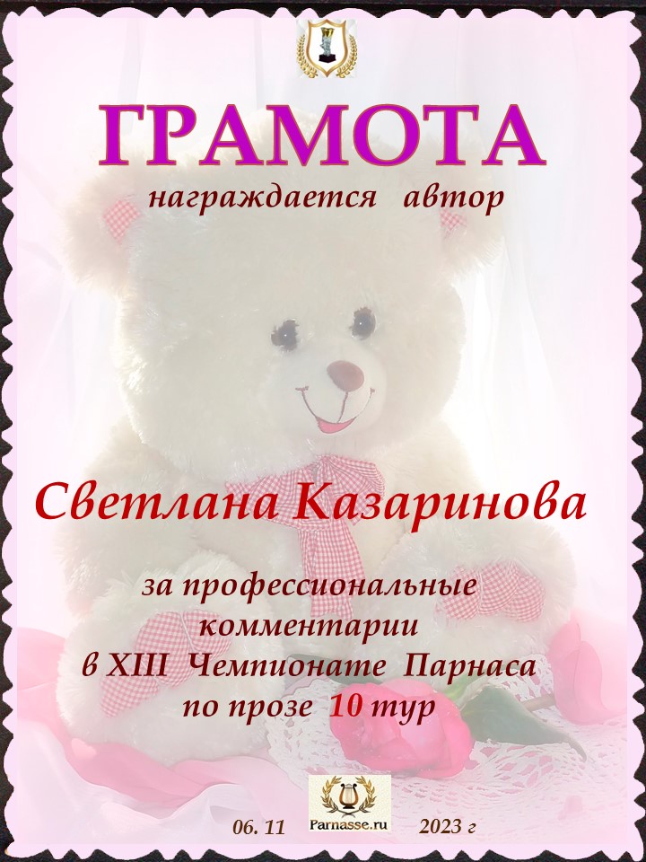 Благодарю за профессиональные комментарии в 10 туре XI Чемпионата Парнаса по Прозе!