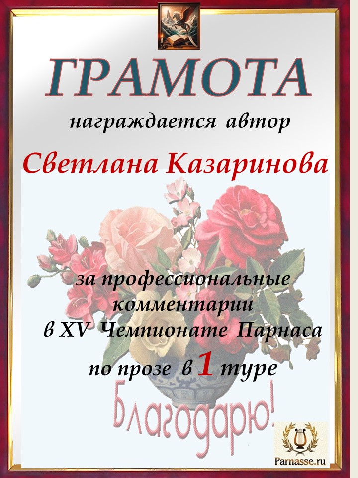 Большое спасибо за профессиональные и объективные комментарии в 1 туре XI Чемпионата Парнаса по Прозе!