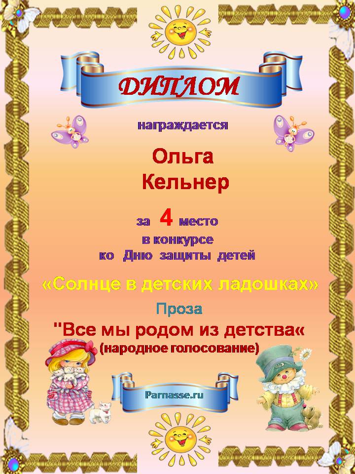 За четвертое место в конкурсе, посвященном Дню защиты детей. Народное голосование. Прозаическая Номинация "Все мы родом из детства". Произведение "школьное сочинение". Поздравляем с прекрасной победой.