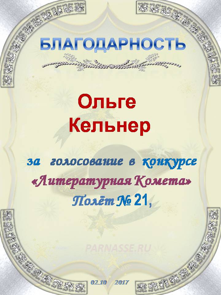 Первое место в праздничном конкурсе "Поздравим Парнас вместе!", в номинации "Лучшее поздравление Парнасу в прозе". Мы в восторге от Вашего блестящего прозаического поздравления и желаем Вам здоровья, счастья, удачи, неизменно бодрой и яркой Музы, а также самых высоких результатов в творчестве! Надеемся, что вместе с Вами мы встретим еще не одну годовщину "Парнаса". Спасибо Вам большое, пусть Вам всегда сопутствует успех в жизни! Произведение "Спасибо Парнас."