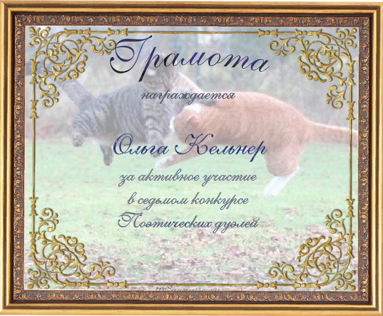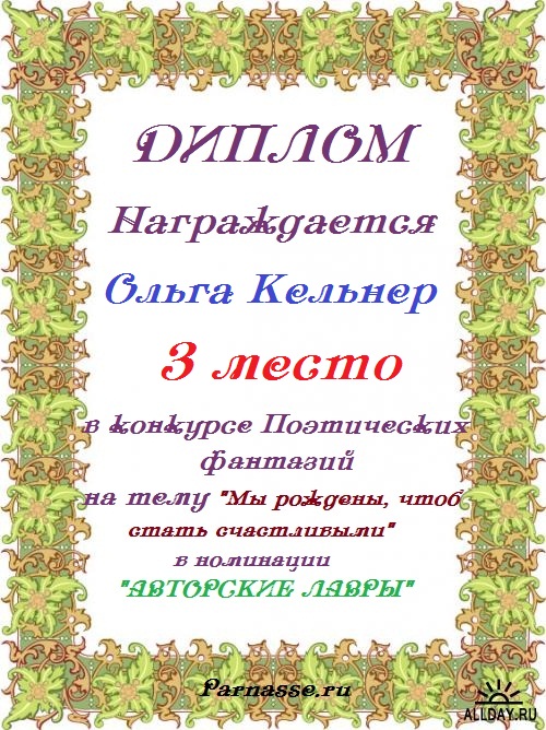 За неугасающую и неисчерпаемую творческую активность, постоянный контакт с Музой и признание сообществом "Парнасцев".От всей души желаем Вам, Ольга, здоровья, любви, успехов, благополучия, удачи и творческого вдохновения!