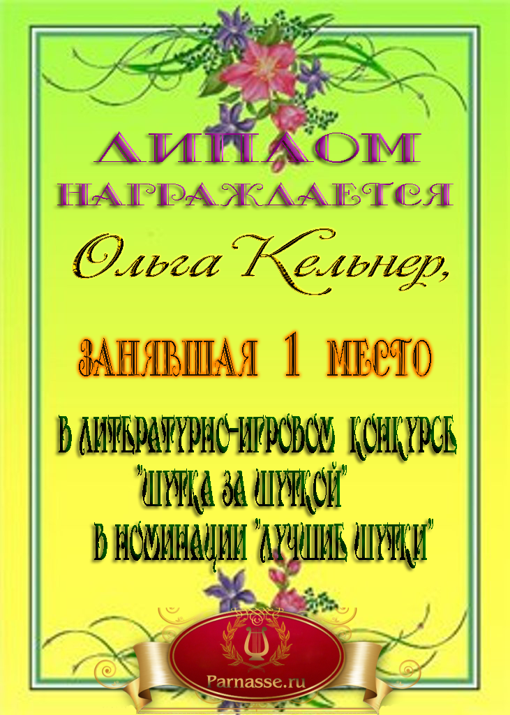 Диплом за 1 место в праздничном конкурсе "Поздравим Парнас с трёхлетием вместе!"