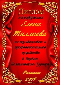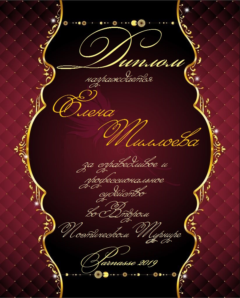 VIP Редактор Парнаса, Модератор, Главный Судья Поэтического Турнира Поэзии, Ведущий Блиц-Конкурса "Золотая ЛитМолния", Главный Судья серии конкурсов про Зиму, Весну, Лето, Осень и многих-многих др.