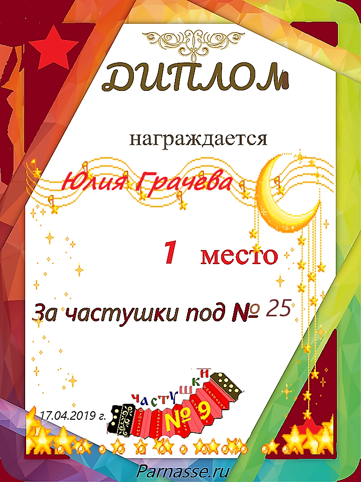 за 1 место в конкурсе "ЧАСТУШКИ" № 9...за частушки под № 25