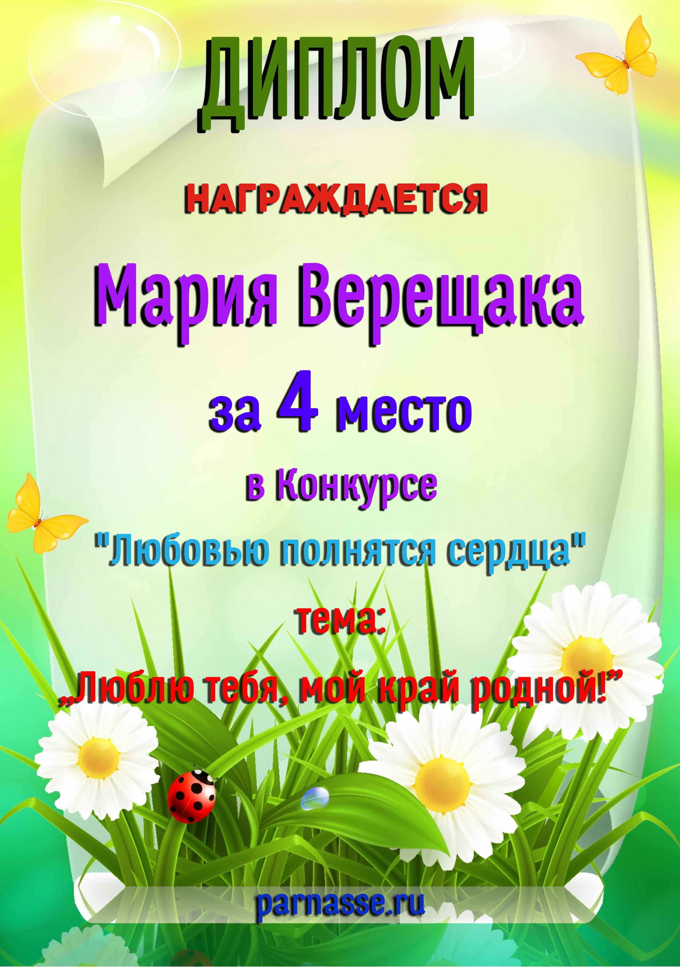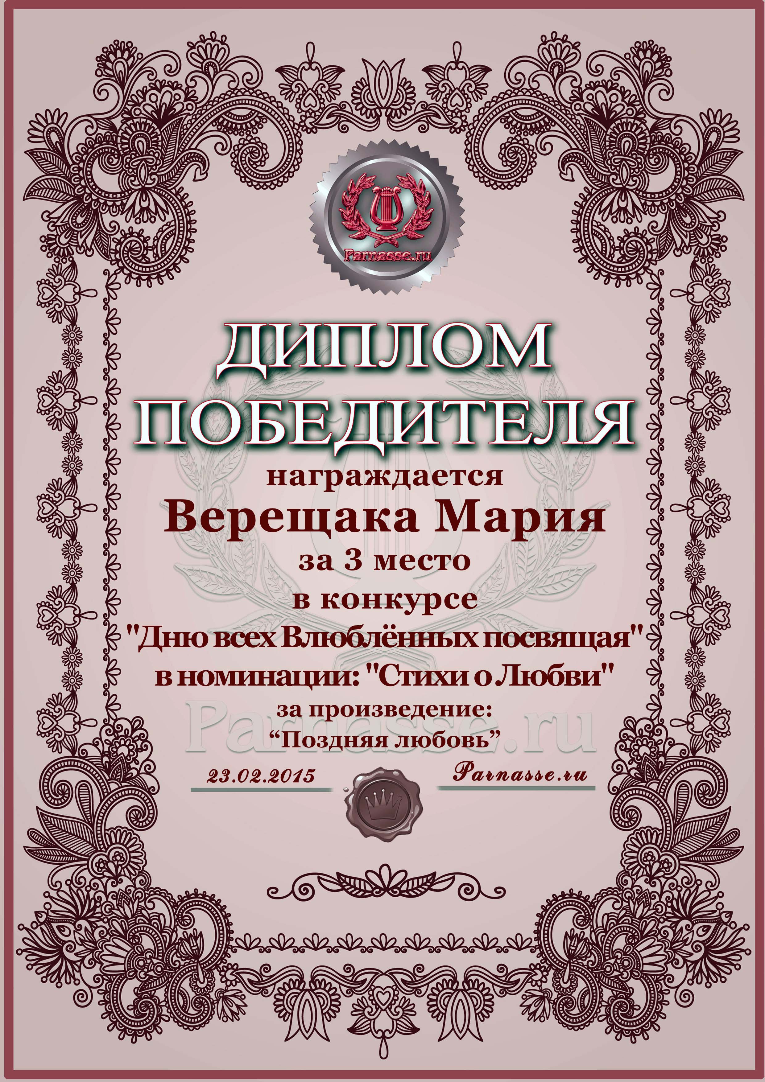 Диплом за 3 место в конкурсе "Дню всех Влюблённых посвящая"