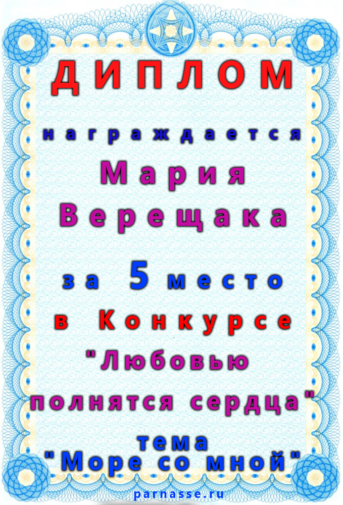 Мария, поздравляем с занятым 3 местом в номинации Стихи о море "О, море-море, ты красиво!" - судейское голосование! Желаем новых творческих побед!