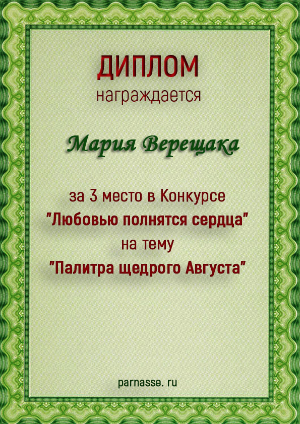 За 3 место в Конкурсе "Любовью полнятся сердца" на тему "Палитра щедрого Августа"