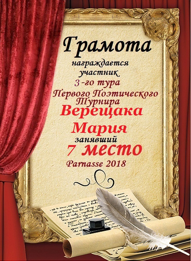 Седьмое место в 3-м туре Первого Поэтического Турнира «Стихи с эпиграфами» за произведение «Я читаю стихи...». Поздравляем!